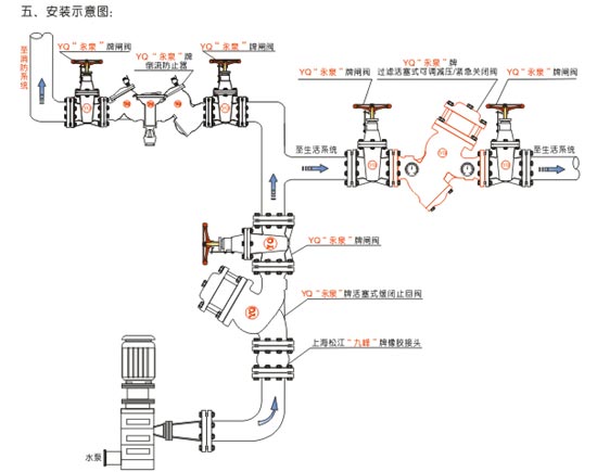 本閥用于生活與消防系統共用的供水系統中,當消防系統開啟時壓力升高,本閥關閉、切斷生活用水,確保消防用水.