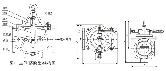 水力控制閥分隔膜型和活塞型兩類,工作原理相同,都是以上下游壓力差△P為動力,由導閥控制,使隔膜(活塞)液壓式差動操作,完全由水力自動調節,從而使主閥閥盤完全開啟或完全關閉或處于調節狀態。當進入隔膜(活塞)上方控制室內的壓力水被排到大氣或下游低壓區時,作用在閥盤底部和隔膜下方的壓力值就大于上方的壓力值,所以將主閥閥盤推到完全開啟的位置;當進入隔膜(活塞)上方控制室的壓力水不能排到大氣或下游低壓區時,作用在隔膜(活塞)上方的壓力值就大于下方的壓力值,所以就會把主閥閥盤壓到完全關閉的位置;當隔膜(活塞)上方控制室內的壓力值處于入口壓力與出口壓力中間時,主閥閥盤就處于調節狀態,其調節位置取決于導管系統中的針閥和可調導閥的聯合控制作用。可調導閥可以通過下游的出口壓力并隨它的變化而開大或關小其自身的小閥口,從而改變隔膜(活塞)上方控制室的壓力值,控制主閥閥盤的調節位置。